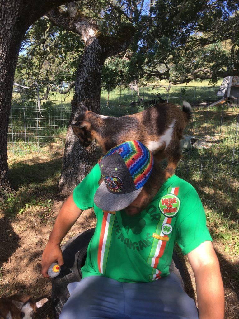 Nigerian Dwarf Goats are small, nimble, and quick. They love jumping up onto high places and people’s shoulders make for a convenient high point.